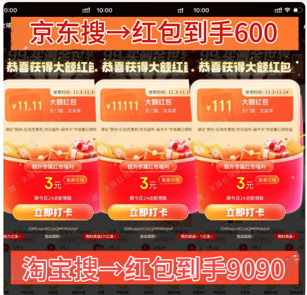 京東APP搜:紅包到手600(每天領(lǐng)三次?。?10月9日開領(lǐng)一直到11月11日!紅包最高11111元!每晚8點(diǎn)還能有機(jī)會(huì)額外領(lǐng)取一次記的查看