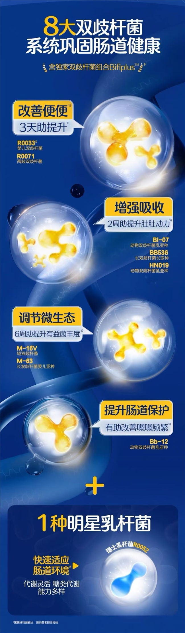 合生元超級(jí)金裝益生菌采用獨(dú)家雙歧桿菌組合Bifiplus™,涵蓋國(guó)家衛(wèi)健委認(rèn)證的8種雙歧桿菌,包括嬰兒雙歧桿菌R0033、兩歧雙歧桿菌R0071等功能明確的核心菌株。雙歧桿菌是源自健康寶寶腸道的原生菌株,具有較好的腸道親和性和適應(yīng)性,能夠快速融入腸道環(huán)境,幫助建立優(yōu)勢(shì)菌群結(jié)構(gòu),進(jìn)而維系腸道健康的穩(wěn)定性。