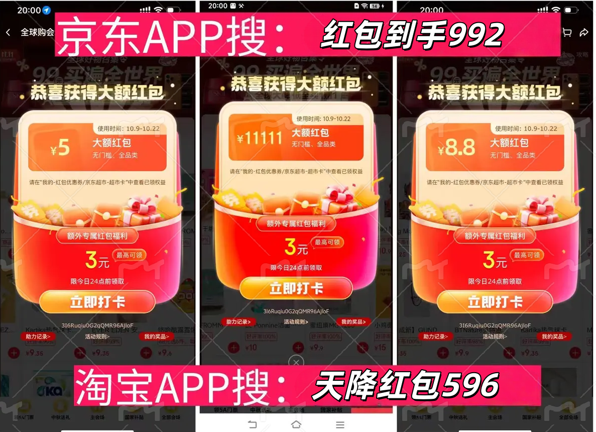 夜場加碼:10月15日-11月11日每晚20:00,兩大平臺額外抽大額紅包,中獎率比白天高3倍。