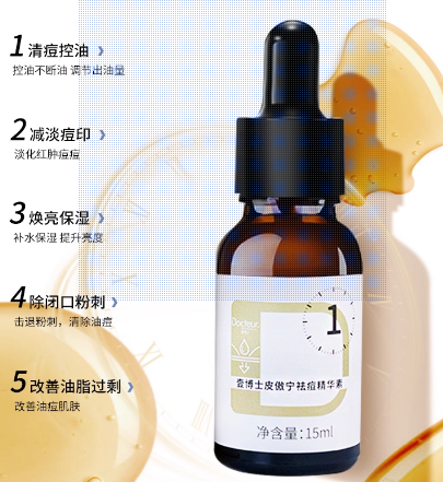 祛痘精華:黃檀樹皮粉、掌葉大黃、地膚、五味子復(fù)配,溫和控油抑炎,維持微生態(tài)平衡。